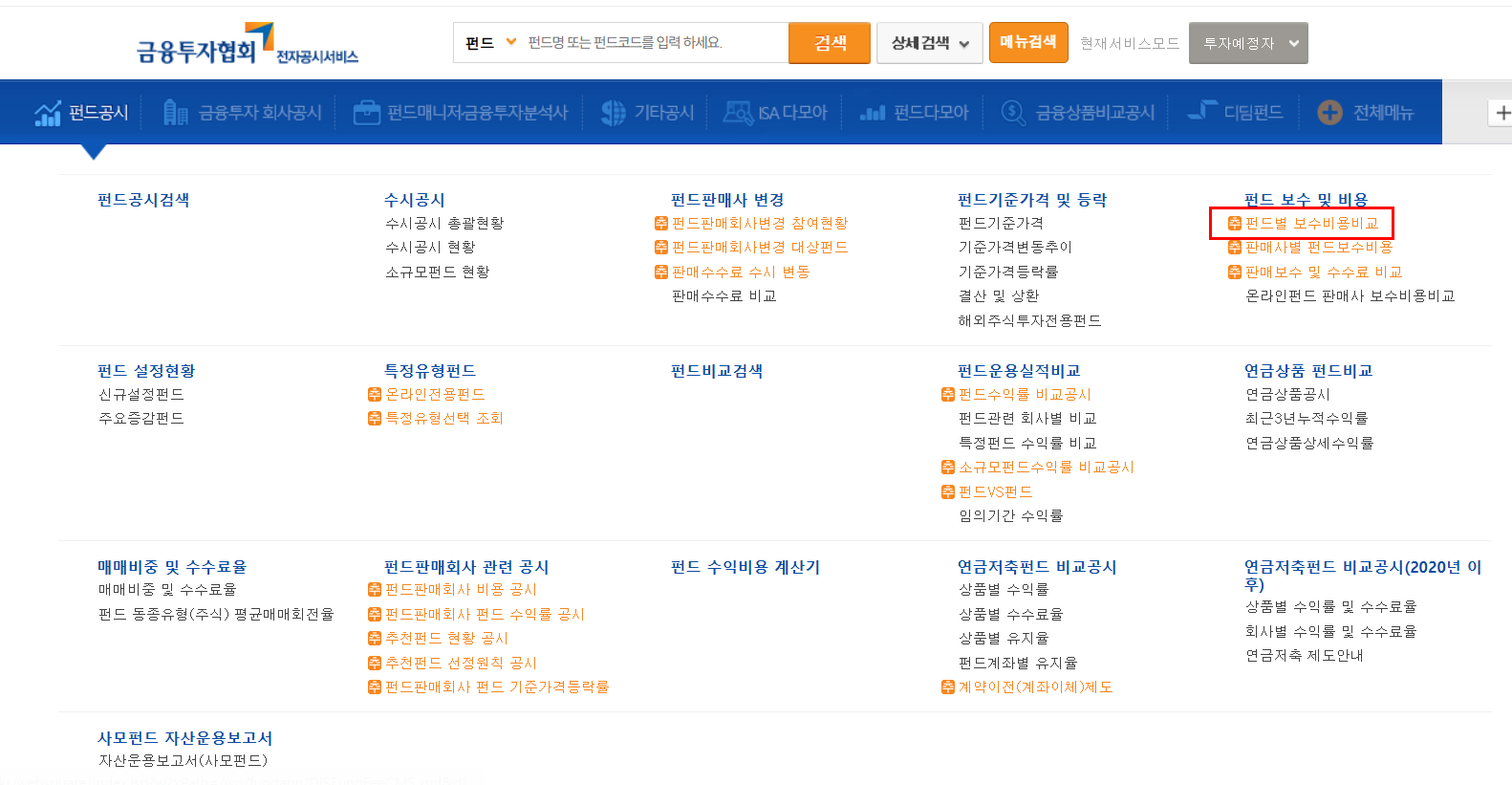 • 상단 메뉴의 [펀드공시]에서 [펀드별 보수비용 비교]이라는 메뉴를 찾으세요.