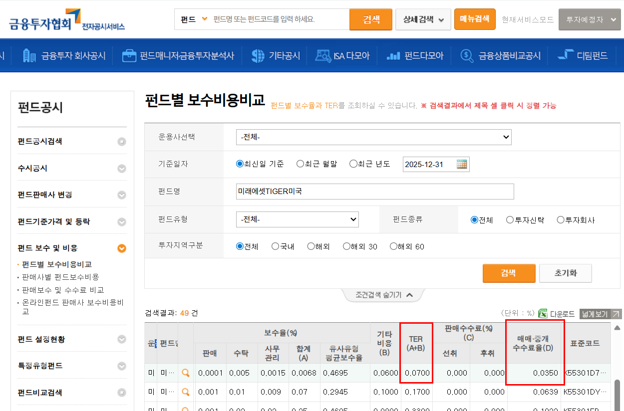 • 여기서 종목명을 치면 TER(총 보수+기타 비용)과 매매중개수수료율이 나옵니다. 이 두 숫자를 더한 것이 여러분이 내는 진짜 비용입니다.