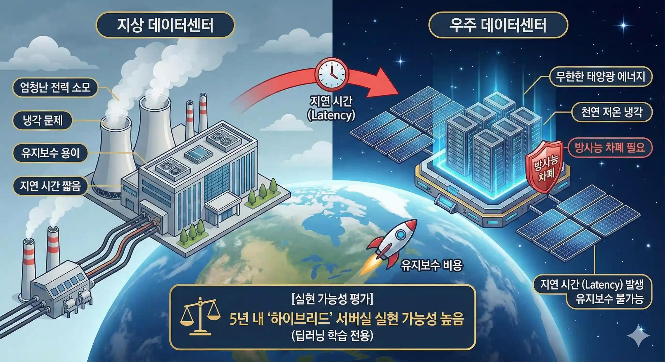 모든 연산을 우주에서 처리하는 것은 아직 시기상조입니다. 다만, 보안이 극도로 중요하거나 실시간성이 낮고 방대한 연산이 필요한 '딥러닝 학습' 전용 하이브리드 서버실로는 5년 내 실현 가능성이 매우 높습니다.