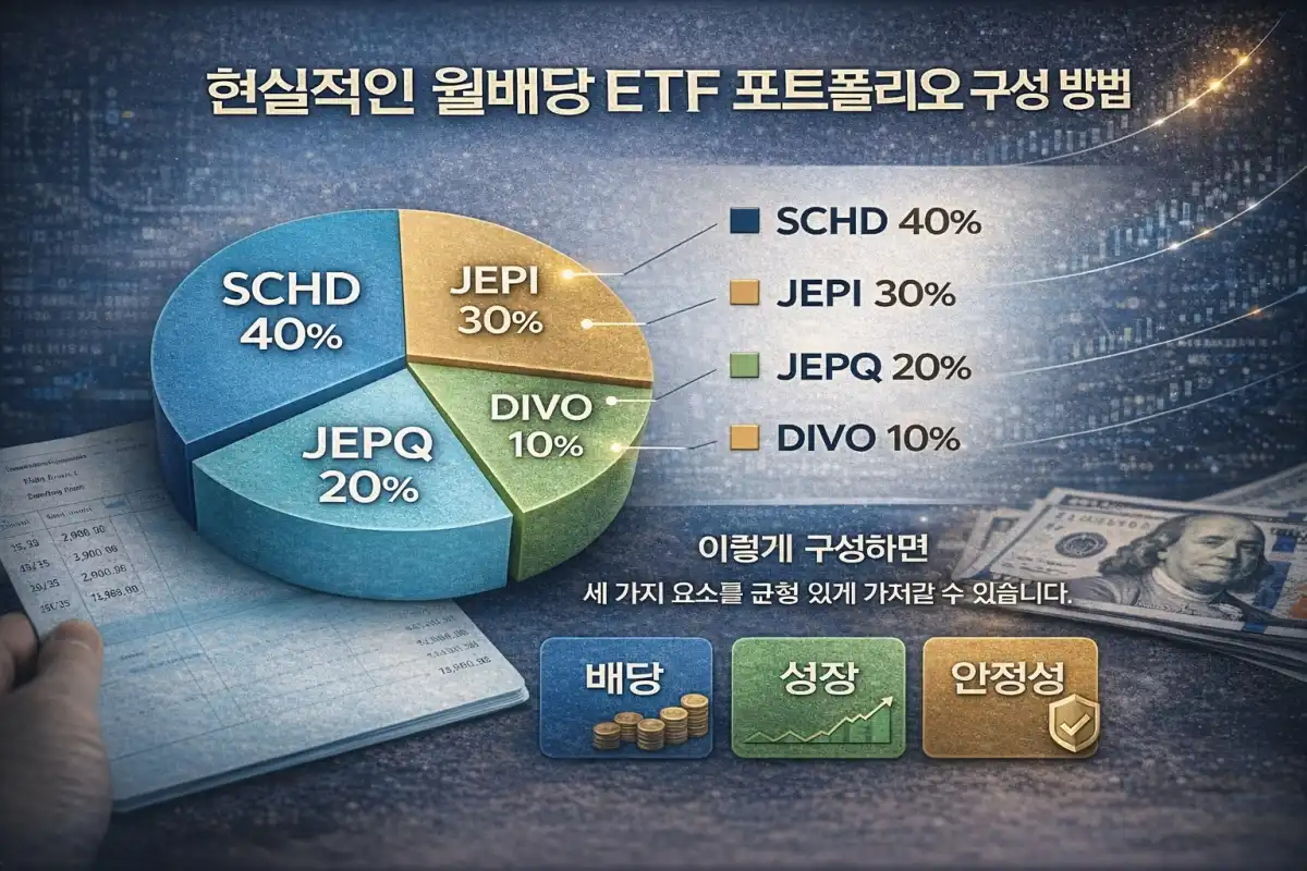따라서 월배당 ETF를 투자 포트폴리오의 전부로 구성하기보다는 성장형 ETF와 함께 조합하는 방식이 더 현실적인 전략이라고 생각합니다. 예를 들어 SCHD 같은 배당 성장 ETF와 JEPI, JEPQ 같은 월배당 ETF를 함께 활용하면 배당과 자본 성장의 균형을 맞출 수 있습니다.