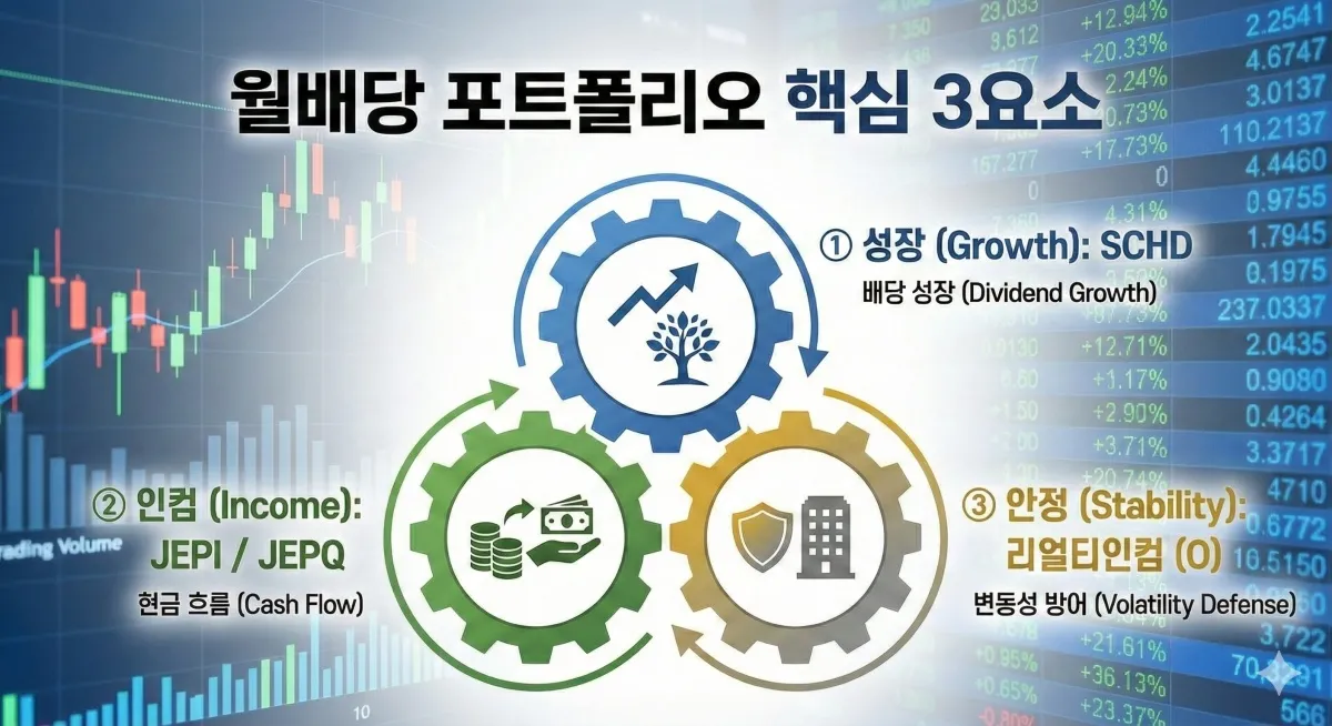 성공적인 월배당 포트폴리오는 성격이 다른 세 가지 축이 조화를 이루어야 합니다.