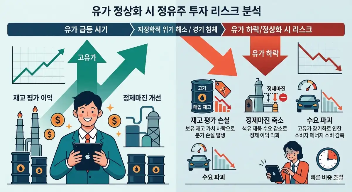 유가 급등 시기에 정유주를 매수할 때 가장 주의해야 할 점은 유가 하락 전환 시의 역효과입니다. 지정학적 위기가 해소되거나 글로벌 경기 침체로 원유 수요가 급감하여 유가가 정상화될 경우, 정유사는 다음과 같은 리스크에 직면합니다.