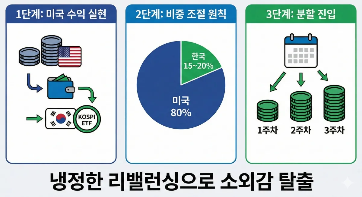미국 주식 비중이 80% 이상이라 국장의 랠리에서 소외감을 느꼈다면, 감정적인 '몰빵 매수'보다는 다음과 같은 냉정한 전략이 필요합니다.
