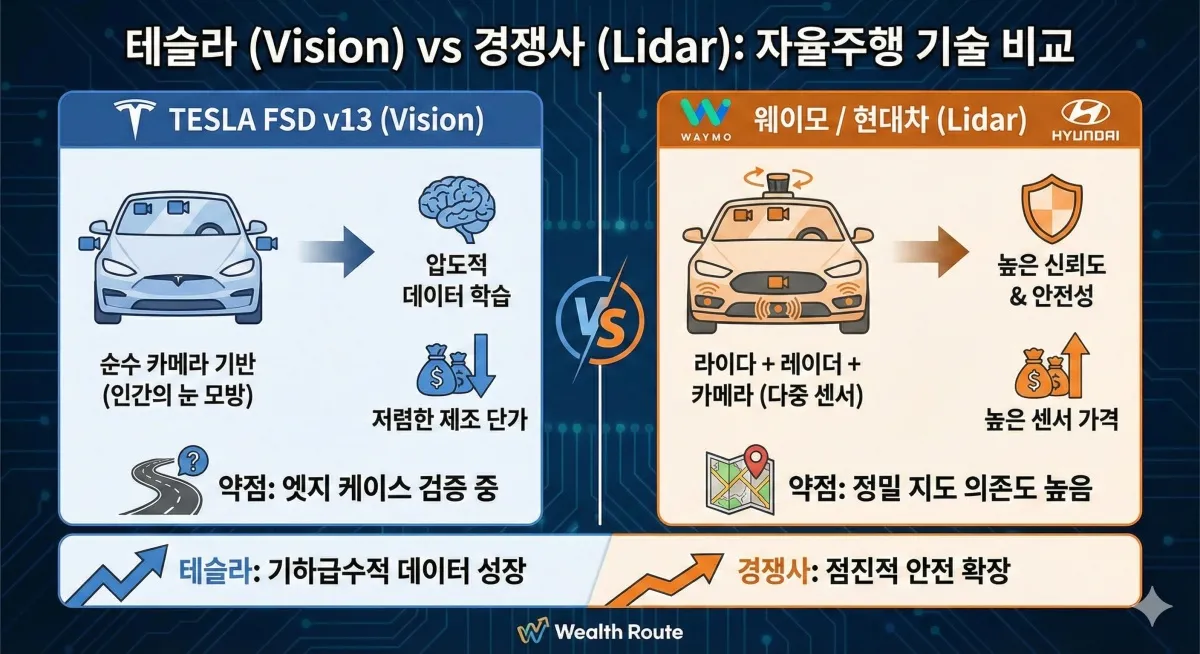 | 비교 항목 | 테슬라 FSD v13 (Vision) | 웨이모 / 현대차 (Lidar) |