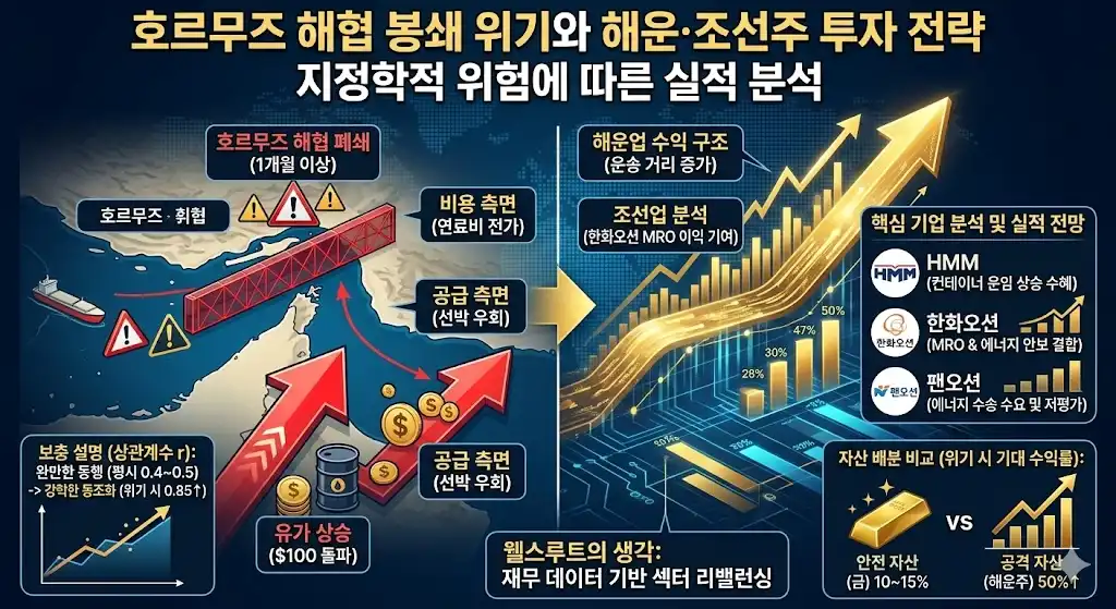 2026년 경제 전망에서 가장 중요한 변수로 떠오른 중동 사태는 해운과 조선 산업의 재무 구조에 직접적인 영향을 미칩니다. 이란의 보복 공격으로 호르무즈 해협이 1개월 이상 폐쇄되는 상황을 가정하여, 자산별 수익률과 산업별 영업이익 기여도를 수치 중심으로 정리했습니다.
