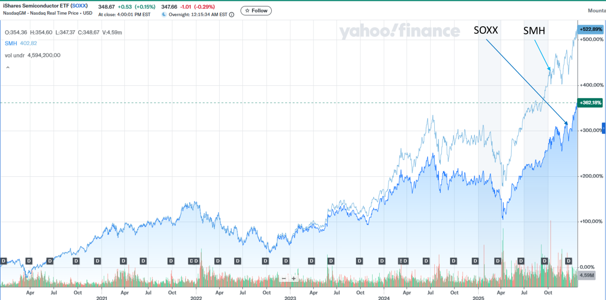 2023년 이후 AI 열풍으로 엔비디아의 주가가 폭등할 때, 비중을 8%로 제한했던 SOXX와 달리 20~25%까지 허용했던 SMH는 그 상승분을 고스란히 수익률로 가져왔습니다.